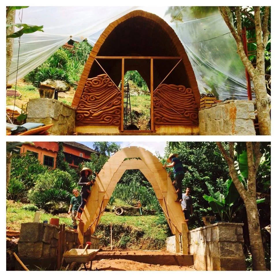 As cúpulas construídas durante os encontros com Gernot Minke e nossas oficinas de Bio-Arquitetura, representam várias técnicas de construção, com adobes, terra e bambu, e calficite. Uma das estruturas em forma de ninho tecido é a passagem que interliga os locais das cúpulas.